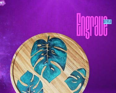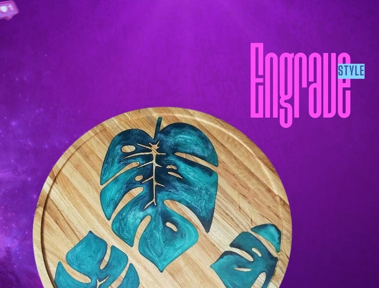 Custom engravings blend with resin to create personalized artwork within furniture.
